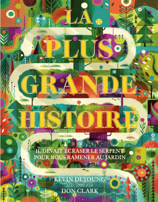 La plus grande histoire, par Kevin DeYoung avec illustrations de Don Clark (BLF Éditions, 2016, 128 pages cartonné 23×18 cm, ISBN 9782362493539, 548 g), présente la Bible comme une seule grande histoire divine : promesse d’un Sauveur écrasant le serpent (Genèse 3:15) pour ramener l’humanité perdue dans le jardin d’Éden. De la chute à la rédemption en Christ, puis la nouvelle création, ce livre illustré magnifiquement relie toutes les « petites histoires » bibliques en un récit cohérent et captivant pour 4-10 ans.